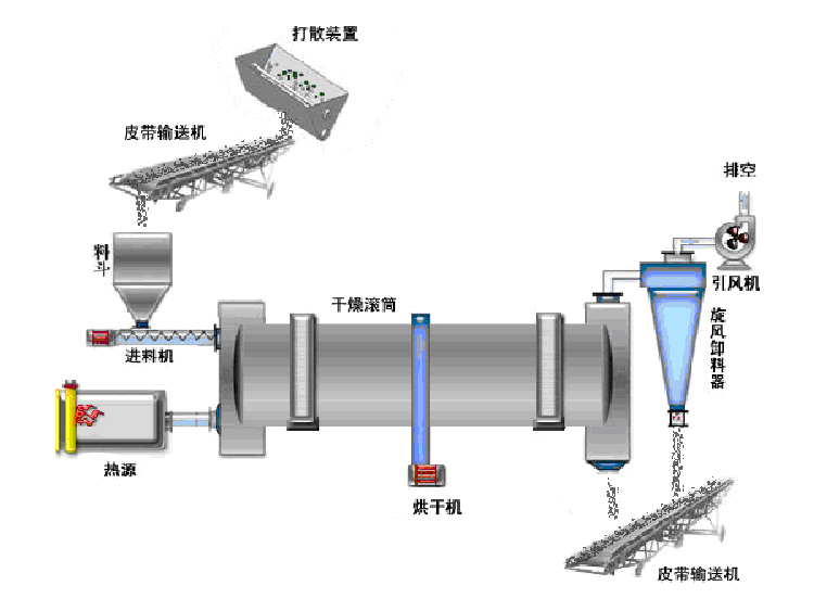 干燥的濕物料由皮帶輸送機(jī)或斗式提升機(jī)送到料斗,然后經(jīng)料斗的加料機(jī)通過加料管道進(jìn)入加料端。加料管道的斜度要大于物料的自然傾角,以便物料順利流入干燥器內(nèi)。干燥器圓筒是一個與水平線略成傾斜的旋轉(zhuǎn)圓筒。物料從較高一端加入,載熱體由低端進(jìn)入,與物料成逆流接觸,也有載熱體和物料一起并流進(jìn)入筒體的。隨著圓筒的轉(zhuǎn)動物料受重力作用運(yùn)行到較底的一端。濕物料在筒體內(nèi)向前移動過程中,直接或間接得到了載熱體的給熱,使?jié)裎锪系靡愿稍?,然后在出料端?jīng)皮帶機(jī)或螺旋輸送機(jī)送出。在筒體內(nèi)壁上裝有抄板,它的作用是把物料抄起來又撒下,使物料與氣流的接觸表面增大,以提高干燥速率并促進(jìn)物料前進(jìn)。載熱體一般分為熱空氣、煙道氣等。載熱體經(jīng)干燥器以后,一般需要旋風(fēng)除塵器將氣體內(nèi)所帶物料捕集下來。如需進(jìn)一步減少尾氣含塵量,還應(yīng)經(jīng)過袋式除塵器或濕法除塵器后再放排放。